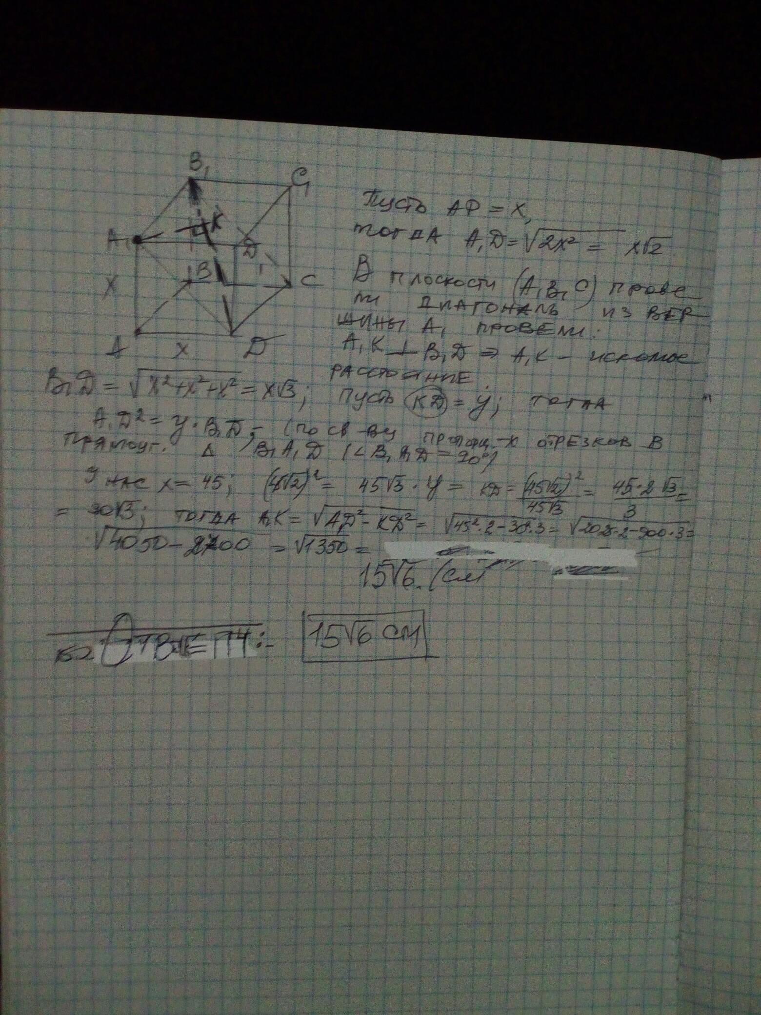 Пусть АВСМА₁В₁С₁М₁-куб, АВ=45см. Все грани равные квадраты.Расстоянием от вершины С₁ до диагонали В₁М будет длина перпендикуляра С₁К.