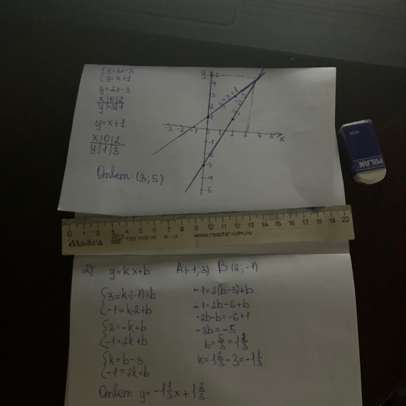 Только в первом задании сделай график по ровнее, и там получится нормальная точка пересечения с координатами( 3;5) это и есть ответ