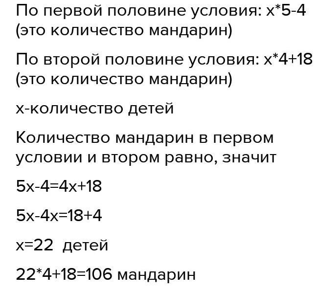 В пакете лежат мандарины. Если раздавать их детям по 5 мандаринов каждому, то не хватит 4 мандаринов, а если раздать по 4 мандарина, то в пакете ещё останется 19 мандаринов. Сколько мандаринов в пакете?