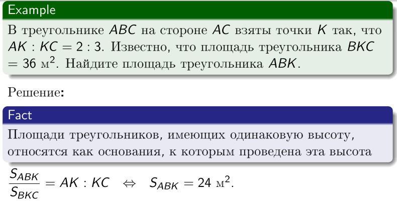 В треугольнике АВС на стороне АС взяты точки К так, что АК: КС = 2: 3. Известно, что площадь треугольника ВКС = 36 м2. Найдите площадь треугольника АВК