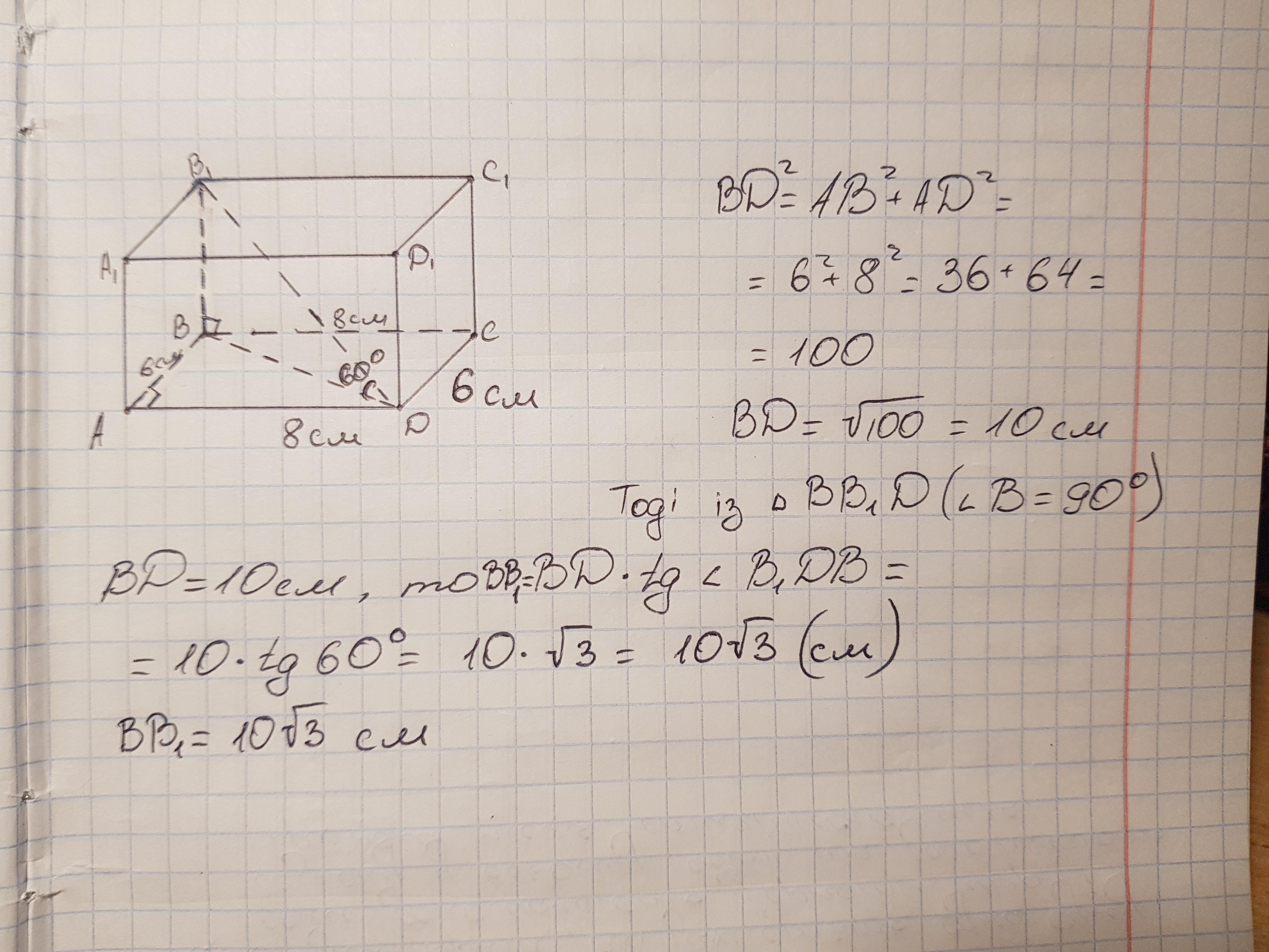 Сторони основи прямокутного паралелепіпеда дорівнює 6 і 8 см, а його діагональ нахилена до площини основи під кутом 60°. Знайдіть бічне ребро паралелепіпеда.
