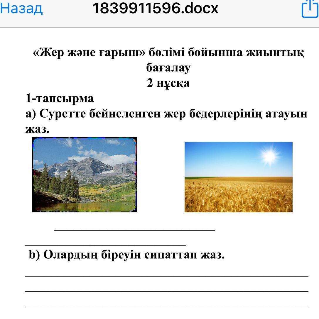 в) Таулы өлке өте көрікті жер. Бұл жерде ағаштардың сан түрі өседі. Мысалы:шырша, қарағай т. б. Ағып өтетін өзеннің суы сондай мөлдір, таза болып келеді. Таулар аспанмен таласқандай биік. Көкше бұлттың өзі күннің сәулесін жауып, жерді ыстықтан қорғап тұрғандай.