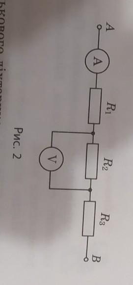 опір яких становить R1=5 Ом; R2=8 Ом; R3=15 Ом. Яким є показ амперметра і чому дорівнює напруга між точками А і В, якщо вольтметр показує 1,6В?