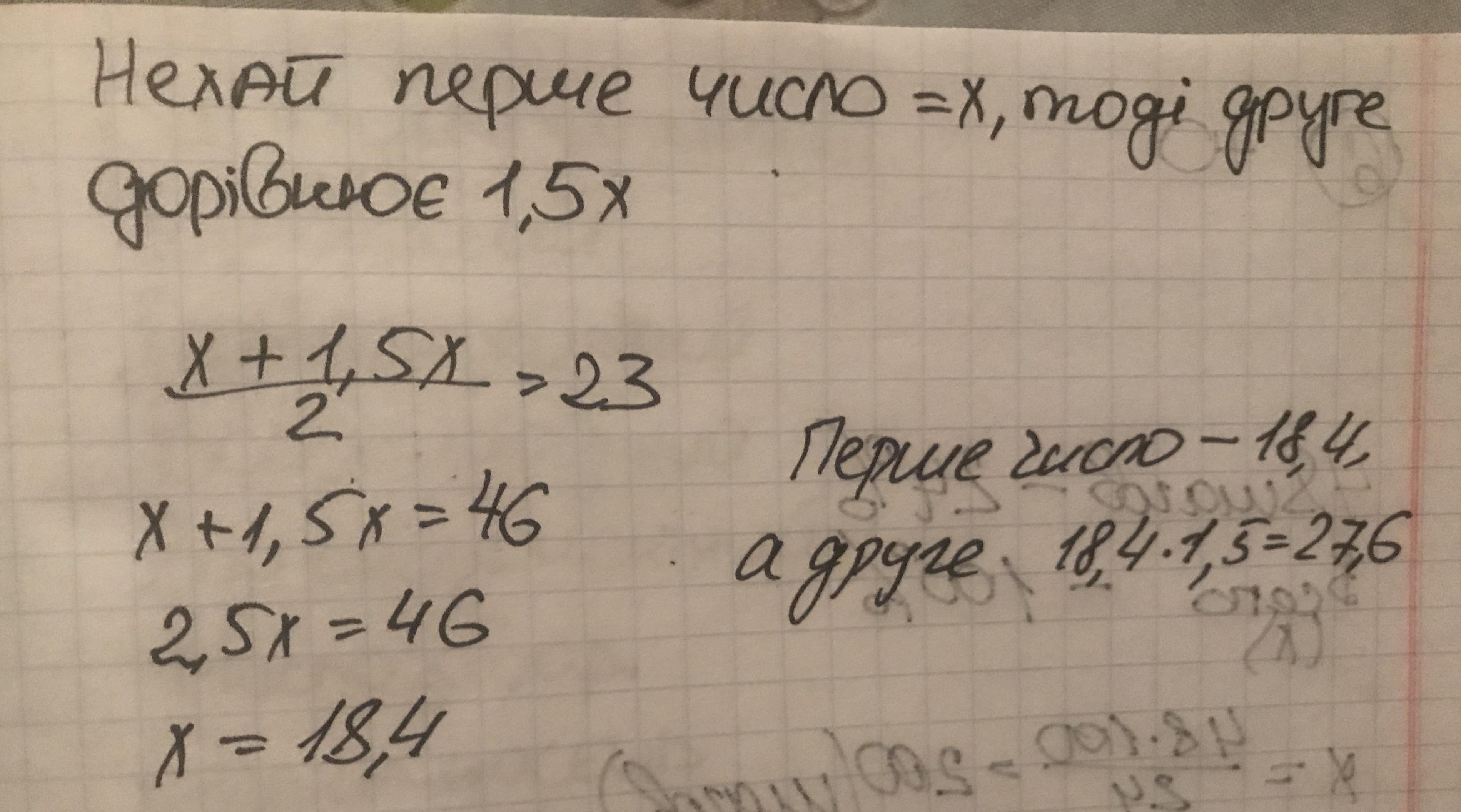 Одне число більше другого в 1,5 рази(-ів), середнє арифметичне цих двох чисел дорівнює 23.