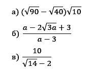 Упростите выражения. В пункте «а» получите числовое значение; в п. «б» − сократите дробь; в п. «в» − избавьтесь от иррациональности в знаменателе: