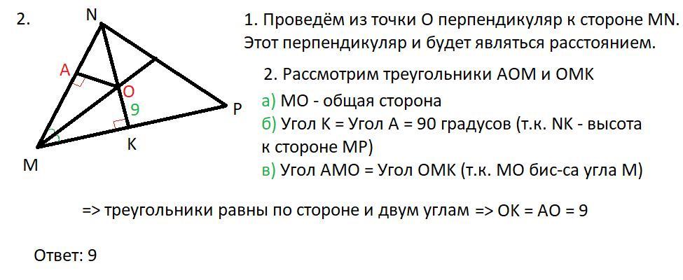 2. В остроугольном треугольнике MNP биссектриса угла M пересекает высоту NK в точке О, причем ОК = 9 см. Найдите расстояние от точки О до прямой MN.