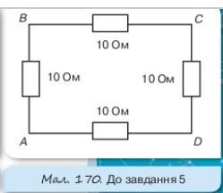 Даю 20 балов. Чотири однакові провідники з опорами по 10 Ом кожний з’єднані, як показано на малюнку 170. Яким буде загальний опір, якщо струм підвести до точок А і С? До точок А і D?