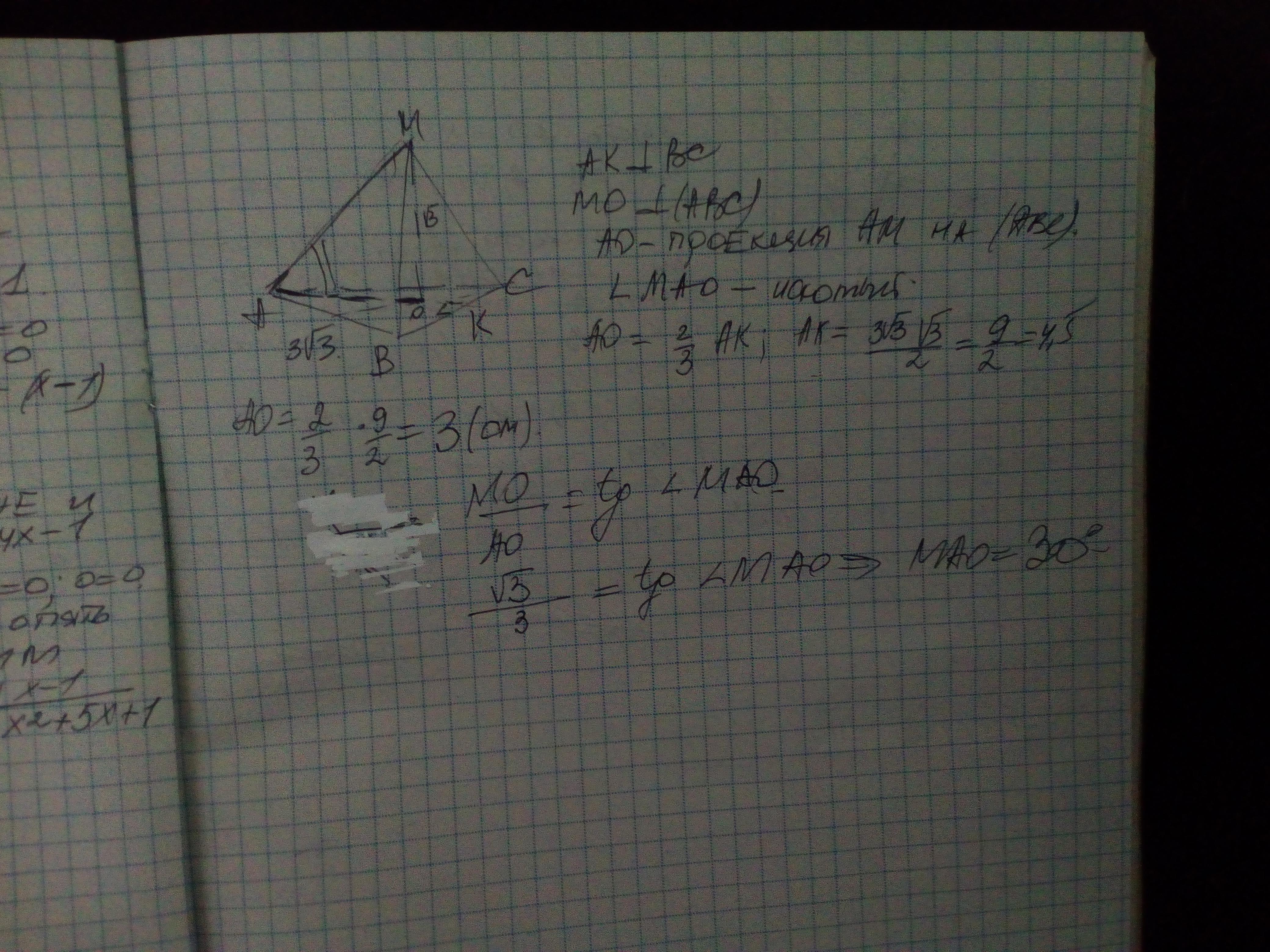 СРОЧНО!! (100 БАЛЛОВ) Точка О – центр правильного треугольника АВС, ОМ – перпендикуляр к плоскости АВС и ОМ=√3см, АВ=3√3см. Найдите угол наклона МА к плоскости треугольника АВС.