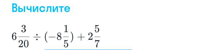 6 frac{3}{20}  div ( - 8 frac{1}{5} ) + 2  frac{5}{7}  =  frac{123}{20}  div ( -  frac{41}{5} ) +  frac{19}{7}  =  frac{123}{20}  times ( -  frac{5}{41} )  +  frac{19}{7}  =  -  frac{3}{4}  +  frac{19}{7}  = - frac{3  times 7}{4 times 7}   +  frac{19 times 4}{7 times 4}  =  frac{-21 + 76}{28}  =  frac{55}{28}  =  1 frac{27}{28}