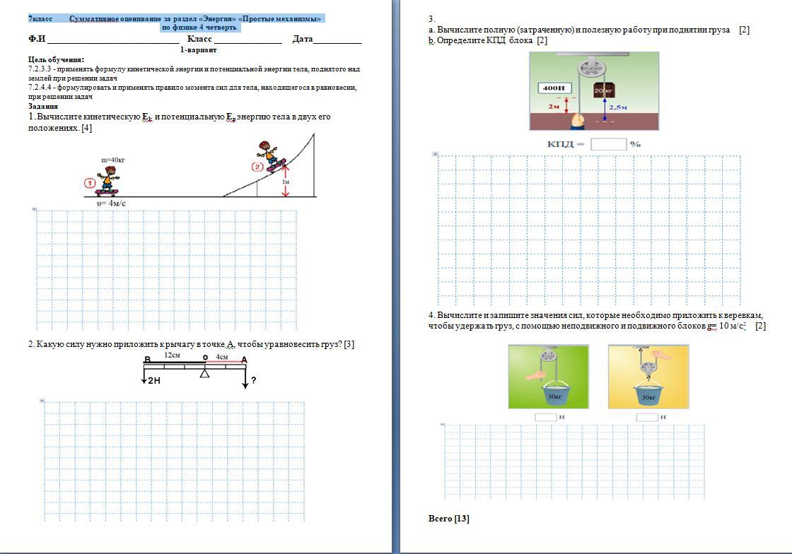 7класс Суммативное оценивание за раздел «Энергия» «Простые механизмы»