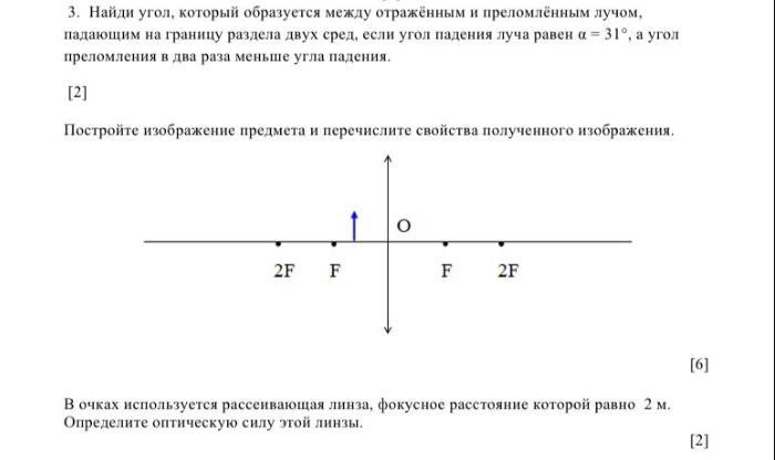 Найдите угол,который образуется между отраженным и преломленным лучом, падающим на границу раздела двух сред, если угол падения луча равен а=31 градус, а угол преломления в два раза меньше угла падения.