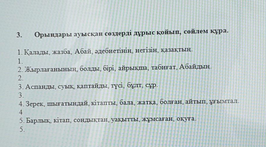 орындары ауысқан сөздері дұрыс қойып , сөйлем құра қалады ; жазба; Абай; әдебиетінің; негізін; қазақтын
