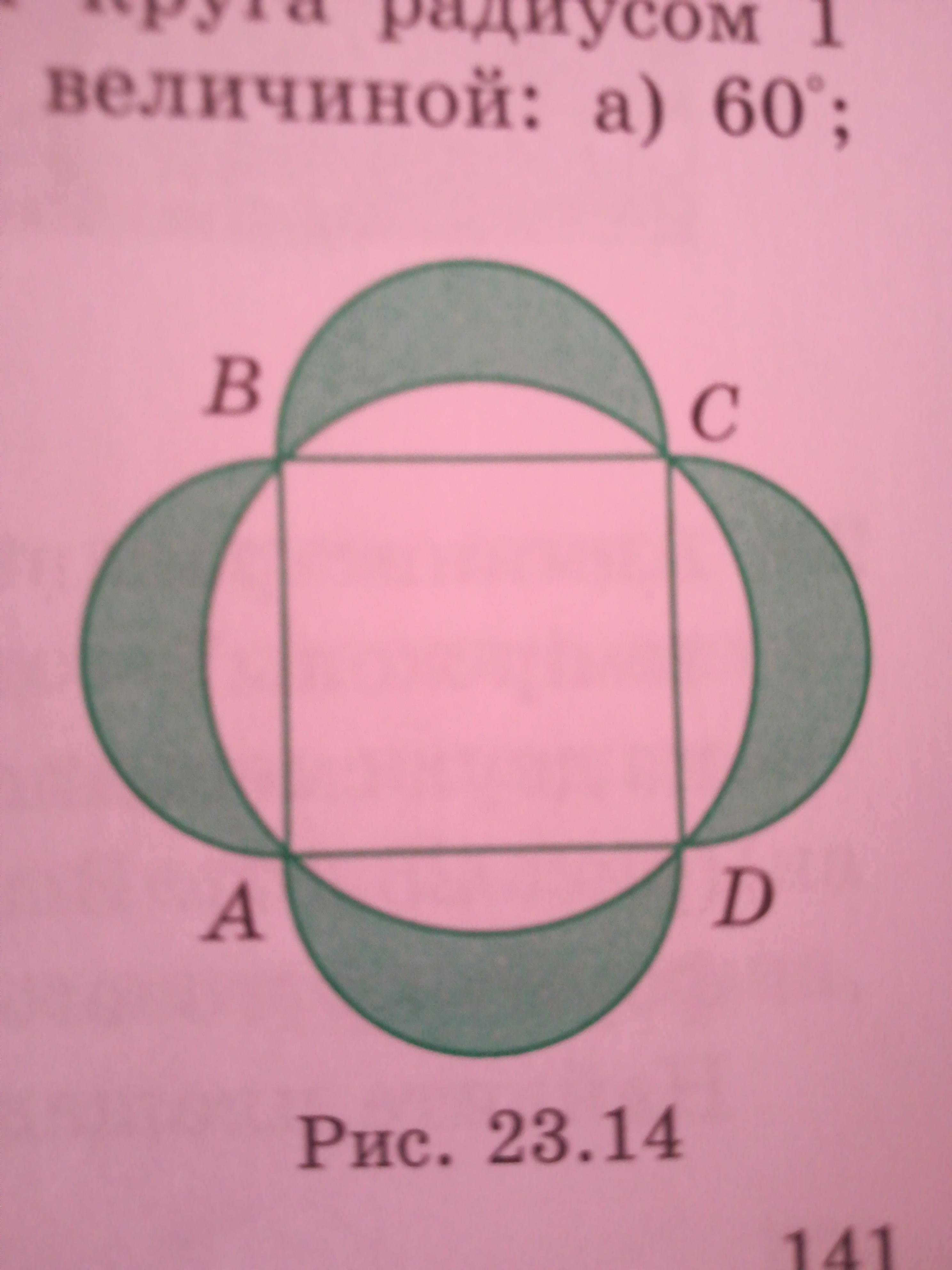 На рисунке 23.14 заштрихованная фигура состоит из четырех, так называемых луночек Гиппократа. Докажите, что ее площадь равна площади квадрата ABCD.