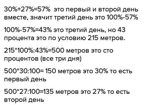100%-57%=43% это третий день, но 43 процента это по условию 215 метров.