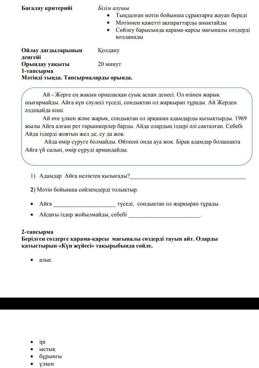 1)Адамдар айға неліктен қызығады?жауабы:Себебі ай өте үлкен жəне жарық сол себепті адамдар айға қызығады.