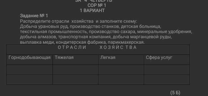 распределите отрасли хозяйства и заполните схему : Добыча урановых руд , производство станков , детская больница , текстильная промышленность , производство сахара , минеральные удобрения , добыча алмазов транспортная компания , добыча марганцевой руды , выплавка меди , кондитерская фабрика , парикмахерская