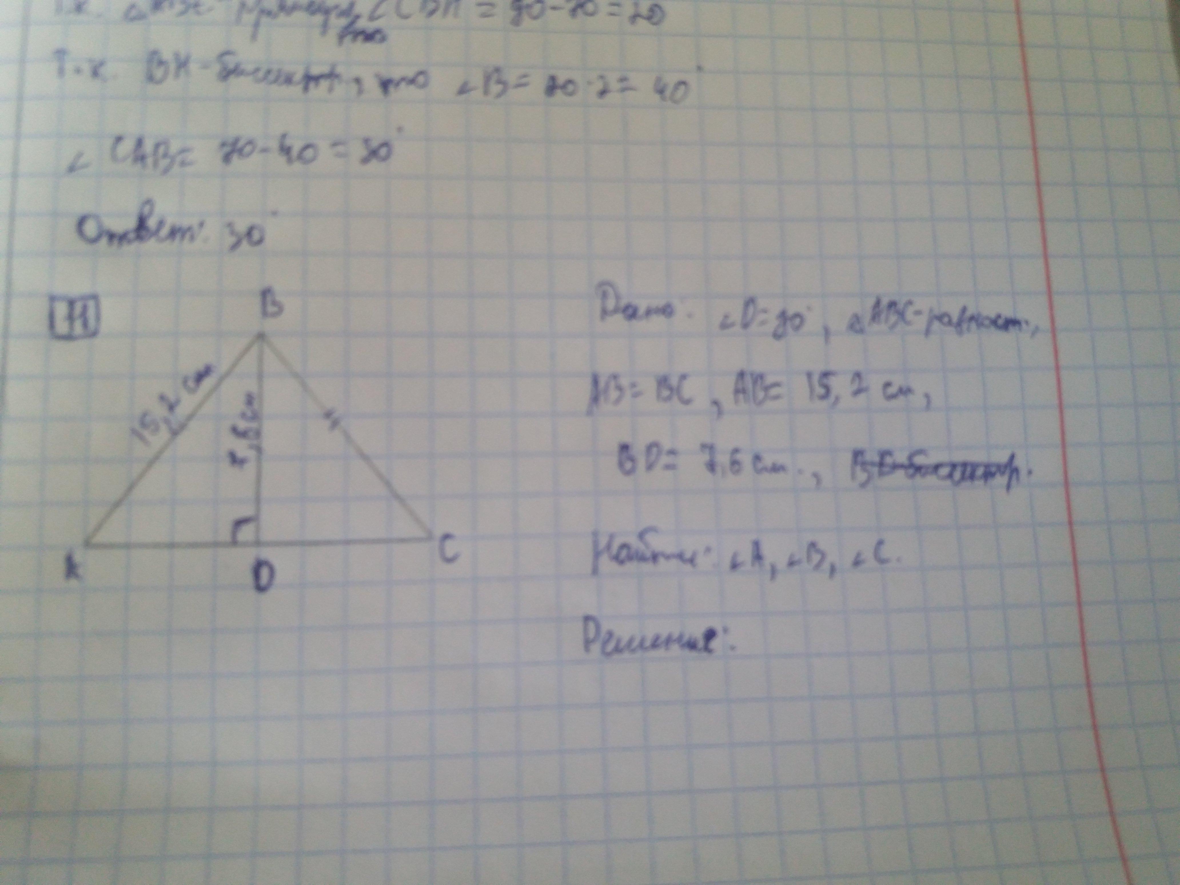 => ∠АВО = ∠СВО = 90 - 30 = 60° (если ∆АВС - равнобедренный, то BO является и медианой, и высотой, и биссектрисой.)