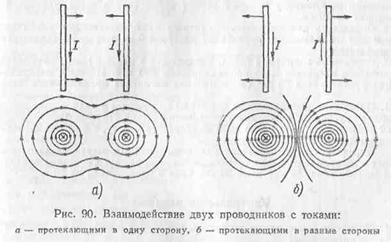 Магнитные линии двух проводников с токами разных направлений в пространстве между проводниками направлены в одну сторону. Магнитные линии, имеющие одинаковое направление, будут взаимно отталкиваться. Поэтому проводники с токами противоположного направления отталкиваются один от другого