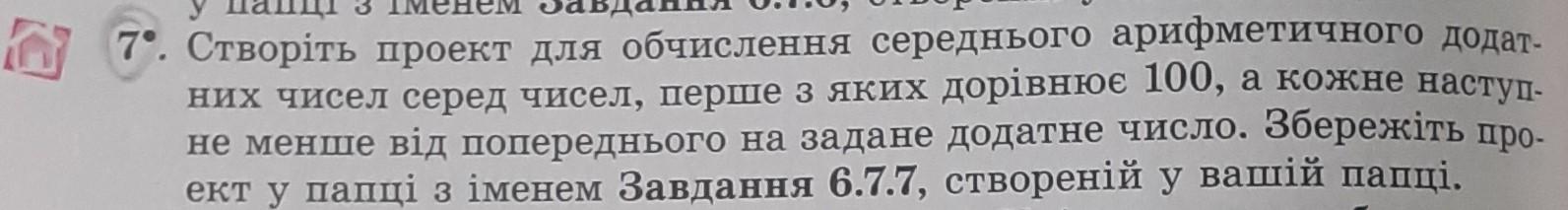 Інформатика 8 клас 6.7.7. Завдання: створіть для обчислення середнього арифметичного додатних чисел, перше з яких дорівнює 100 , а кожне наступне менше від попереднього на задане додатне число. ДАЮ 30 БАЛІВ!!!