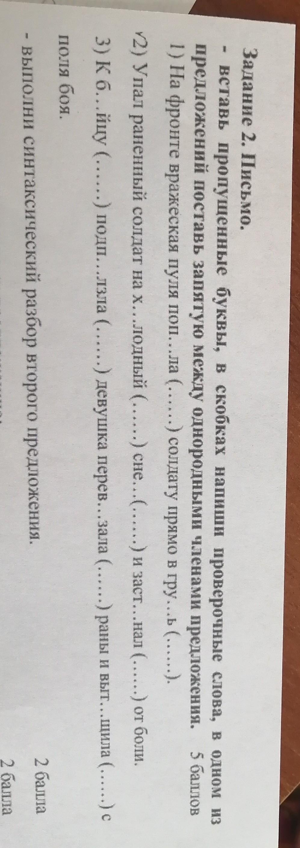 2)Упал раненый солдат на холодный (холод) снег (снегопад) и застонал (стон) от боли.