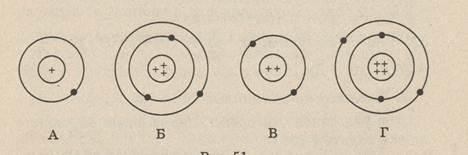 На рисунке изображены схемы четырёх атомов. Чёрные точки – электроны.