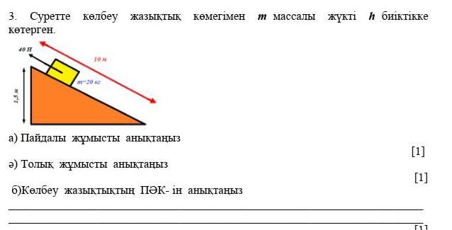 суретте көлбеу жазықтық көмегіме m массалы жүкті h биіктікке көтерген​