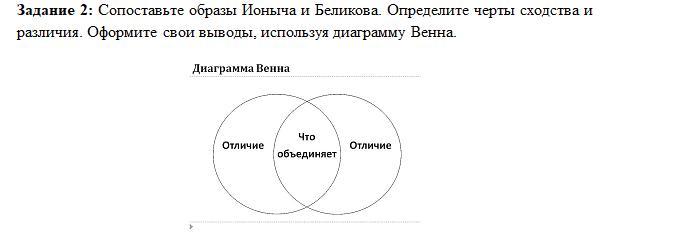 Сопоставьте образы Ионыча и Беликова. Определите черты сходства и различия. Оформите свои выводы, используя диаграмму Венна.