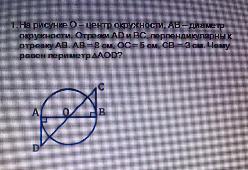 На рисунке О центр окружности, АВ диаметр окружности. отрезки АВ, ВС перпендикулярны к отрезкв АВ, АВ=8см, ОС=5см, СВ =3 см. Чему равен периметр АОD? Помогите,если можете, буду очень благодарна.