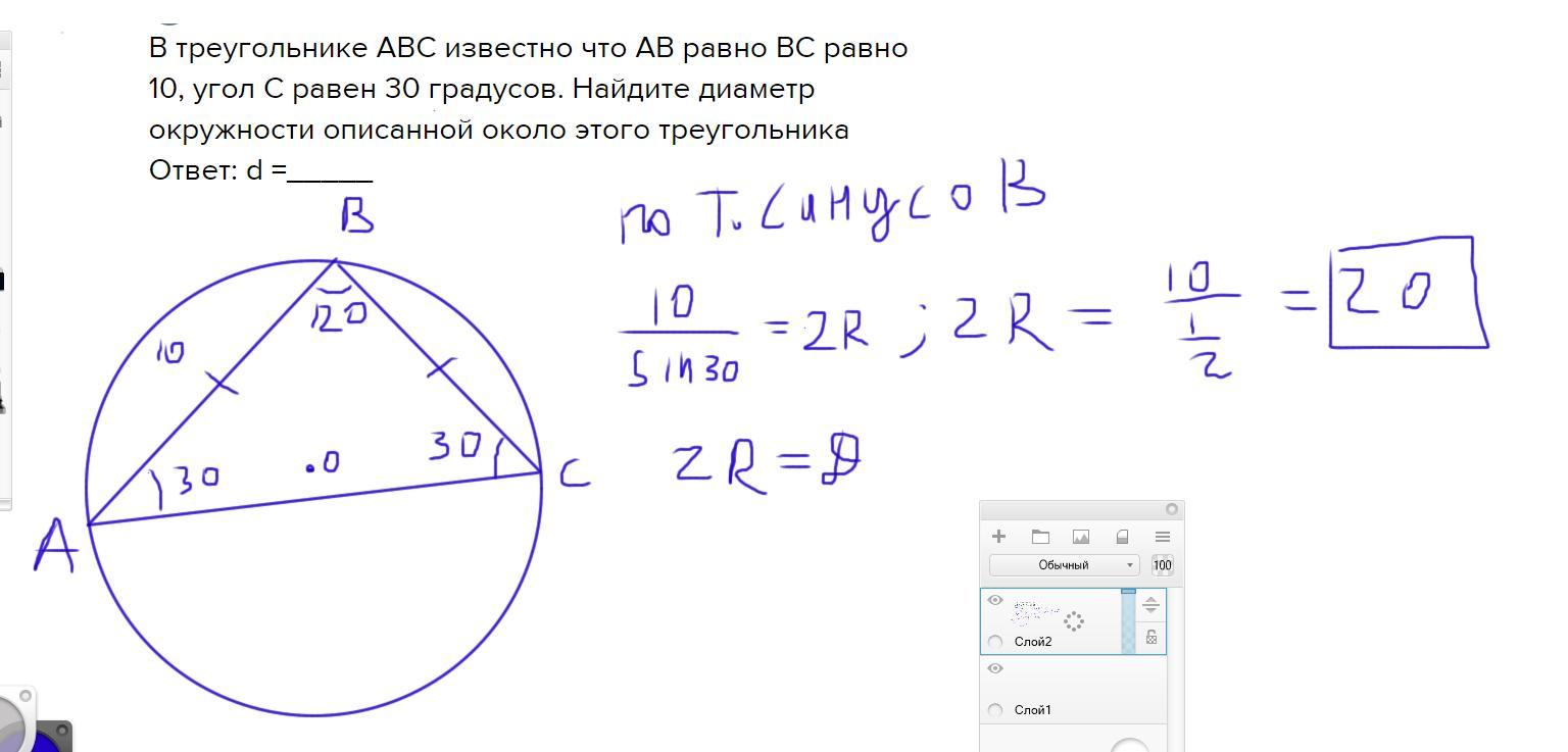 В треугольнике ABC известно что AB равно BC равно 10, угол C равен 30 градусов. Найдите диаметр окружности описанной около этого треугольника