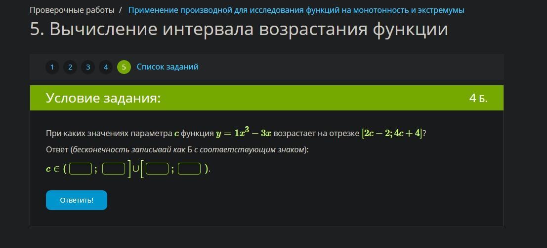 При каких значениях параметра c функция y=1x3−3x возрастает на отрезке [2c−2;4c+4]?
