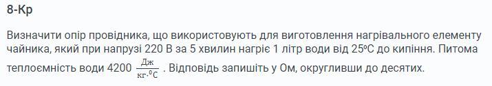 Визначити опір провідника, що використовують для виготовлення нагрівального елементу чайника, який при напрузі 220 В за 5 хвилин нагріє 1 літр води від 25⁰С до кипіння. Питома теплоємність води 4200
