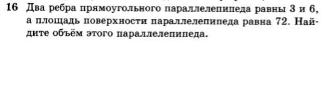 Два ребра прямоуг. параллепипеда равны 3 и 6 Площадь поверхности параллепипеда равна 72. Найти объем этого парал.