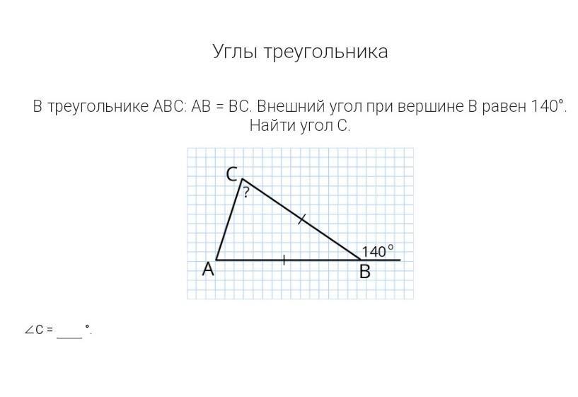 В треугольники ABC AB равно BC внешний угол при вершине B равен 140 градусов. Найдите угол C. C=?