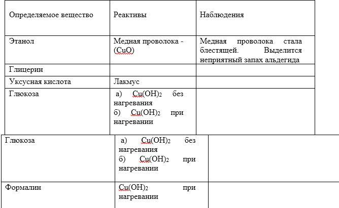 Опытным путем определите каждое из выданных вам веществ. Для этого проведите мысленный эксперимент, заполните таблицу