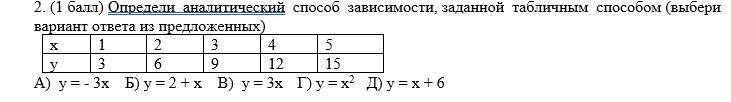2. (1 балл) Определи аналитический способ зависимости, заданной табличным способом (выбери вариант ответа из предложенных)