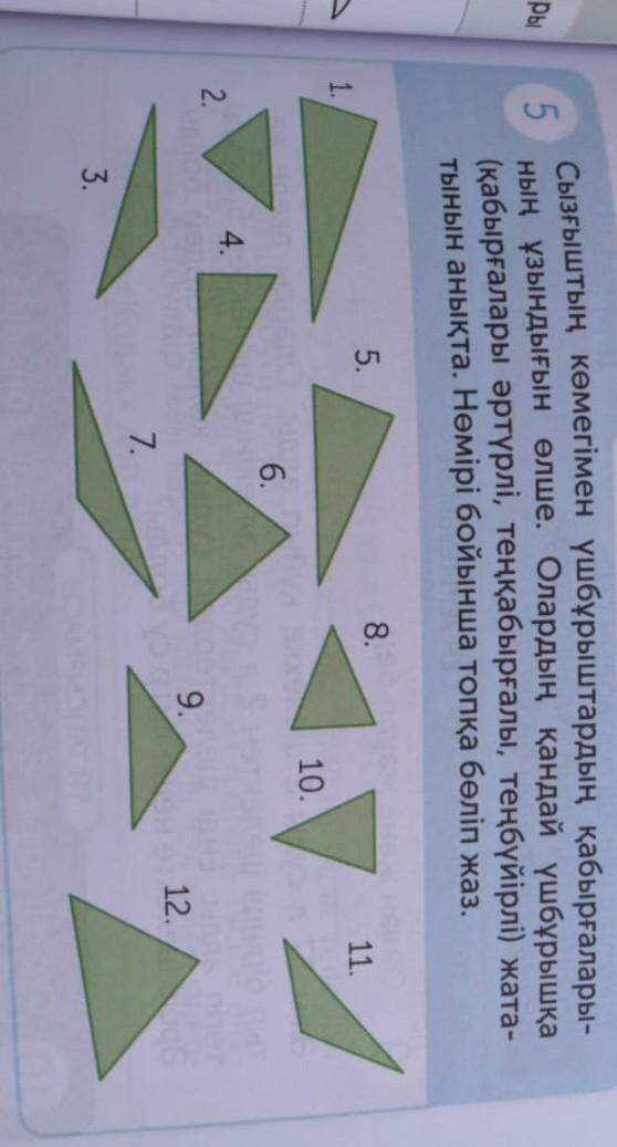 Сызғыштың көмегімен үшбұрыштардың қабырғаларынын ұзындығын өлше. Олардың қандай үшбұрышқа (қабырғалары әртүрлі, теңқабырғалы, теңбүйірлі) жататынын анықта. Нөмірі топқа бөліп жаз.