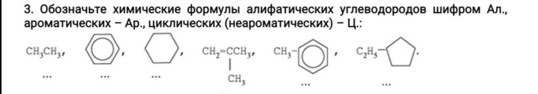Обозначьте химические формулы алифатических углеводородов шифром Ал., ароматических – Ар., циклических (неароматических) – Ц.: