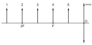 На рисунке изображены пять предметов 1,2,3,4 и 5, расположенные перед тонкой собирающей линзой с фокусным расстоянием F . Изображение какого предмета в этой линзе будет увеличенным, перевёрнутым и действительным?