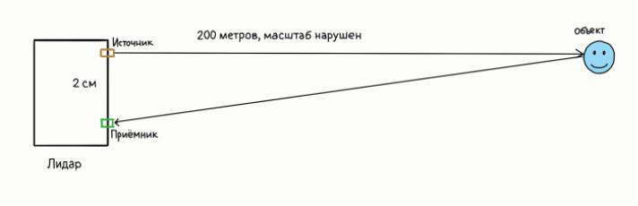 Объект расположен на высоте источника сигнала. Расстояние между источником и приёмником сигнала по вертикали — 2 см, а от лидара до объекта — 200 метров (см. рис.). Рассчитайте, через сколько наносекунд сигнал дойдет до объекта, и, отражённый от объекта, дойдёт до приёмника? Скорость сигнала примем равной 300 000 000 м/сек. 1 наносекунда = 10 в степени −9 или 1/1.000.000.000 сек.