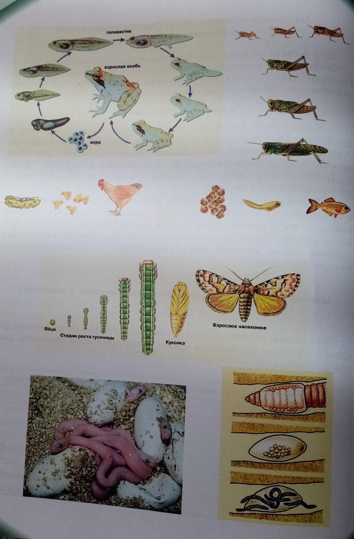 Определите, онтогенез каких животных изображён на данных рисунках. Укажите в таблице к каким типам онтогенеза относятся данные изображения.