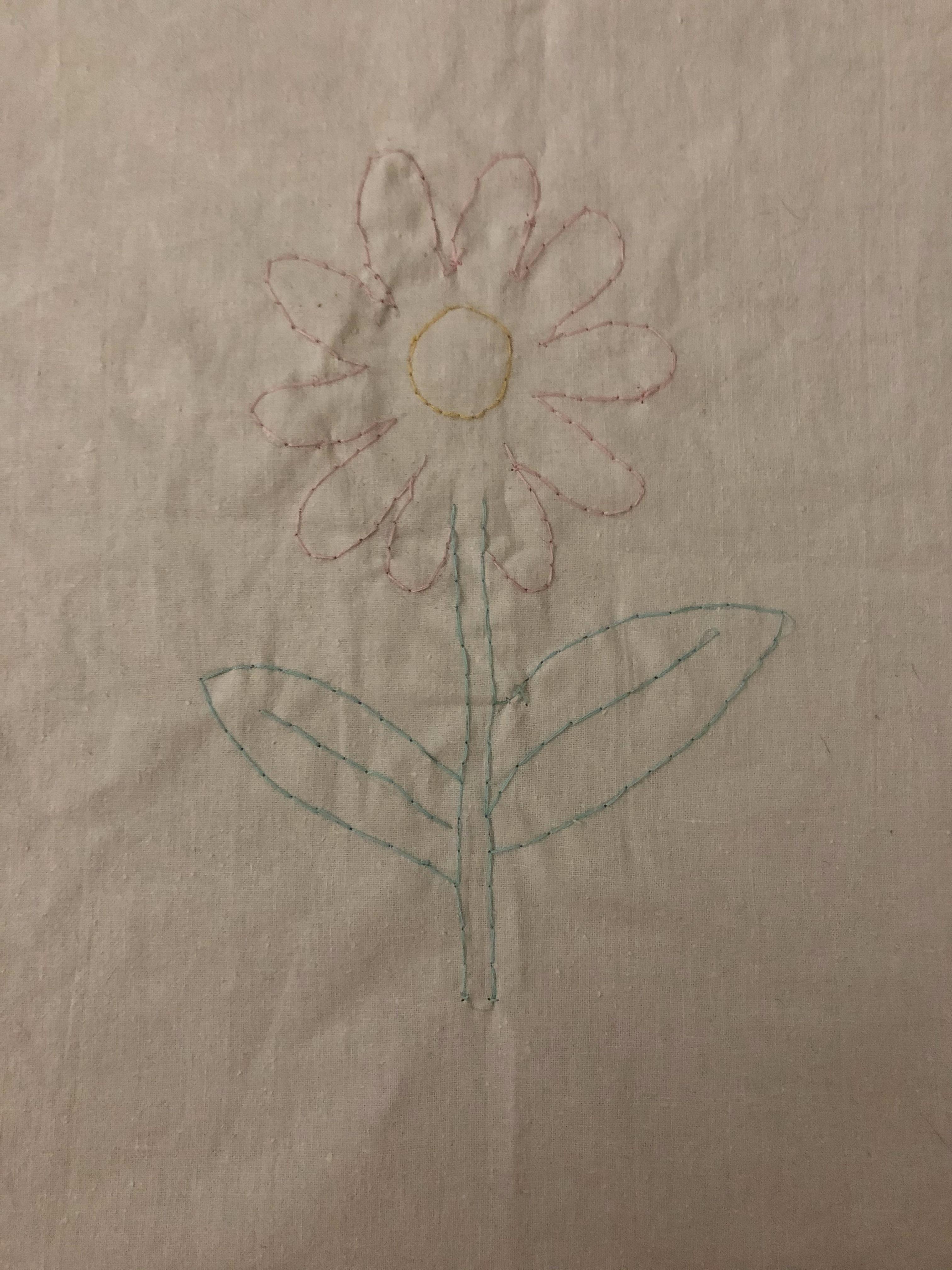 На бежевом листке нарисован небольшой цветок. У него два листочка на стебельке. Причём они большие и ярко зелёные. У цветка 10 красных лепесточков. По середине жёлтый кружок - бутон. Нарисован он явно карандашом. На листах видны прожилки. Цветок держится на стойком прямом зелёном стебельке. Цветок нарисован, растёт один одинешинек. Лепестки его симетричны. Сам он очень красивый, хоть и один.