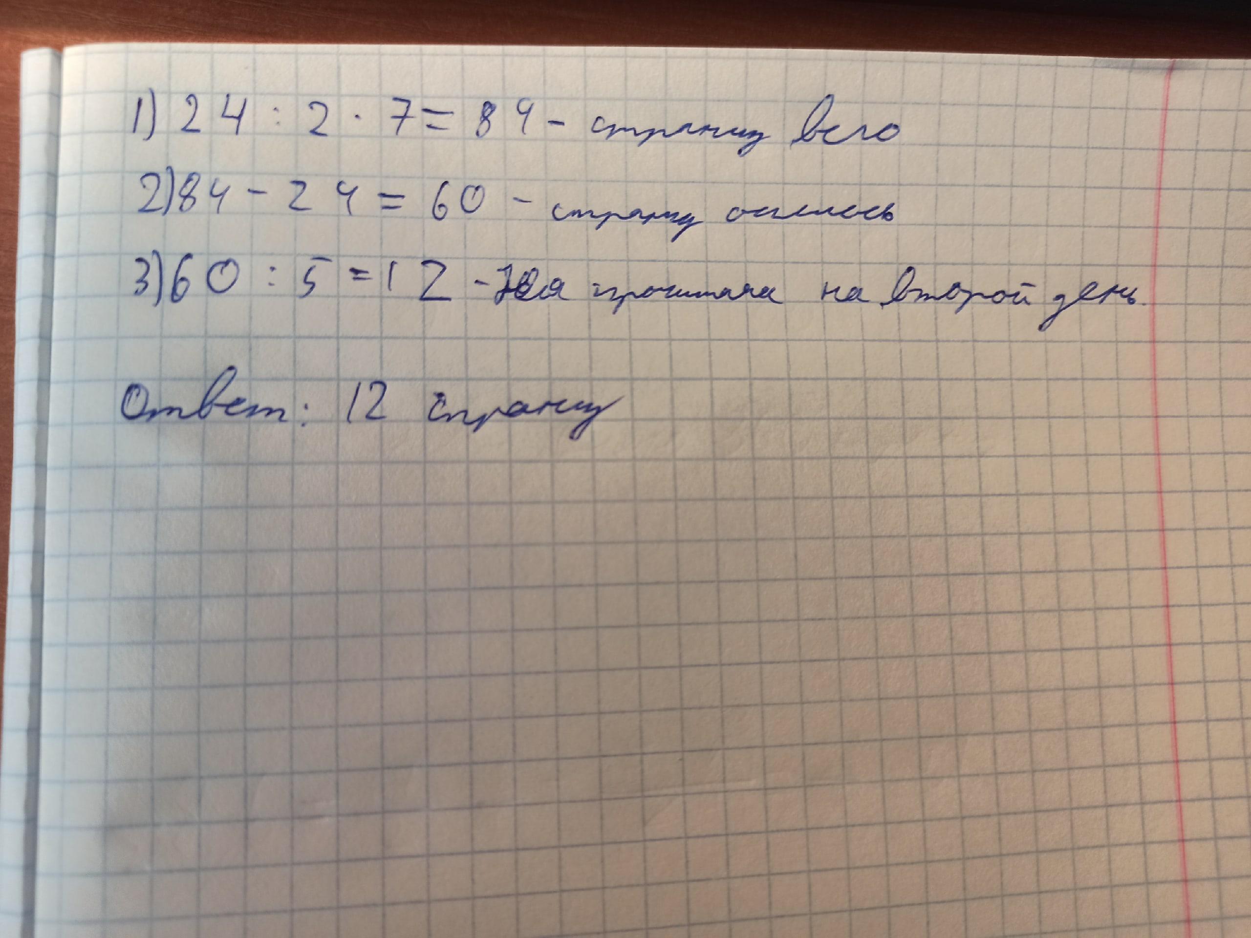 Юля в первый день прочитала 24 стронице,что составляло 2/7 все строциц в книжке.второй день она прочитала 1/5остальных страниц.сколько страниц юля прочитала на второй день.