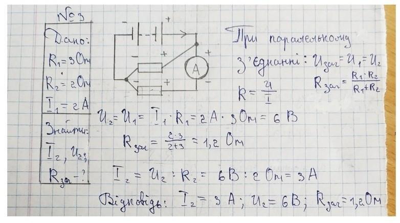 Опір резисторів відповідно 30м і 20м. Амперметр на першому резисторі показує 2A. Визначити силу струму та напругу на другому резисторі, загальний опір на ділянці кола.