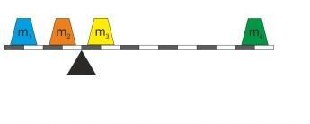 Дан невесомый рычаг с двумя противовесами на каждой стороне. Массы противовесов m1=8 кг, m2=41 кг и m3=20 кг. Какова масса противовеса m4, если рычаг находится в равновесии?
