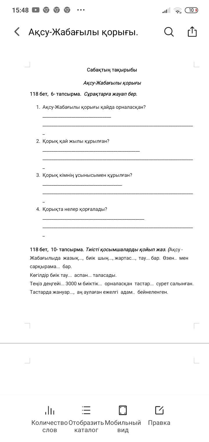 Ответ:1. Жамбыл облысының Жуалы ауданы мен Түркістан облысының Түлкібас ауданы аумағында орналасқан2.1926жылы.3.Қазір Ақсу–Жабағылы қорығы ЮНЕСКО жасаған дүниежүзілік қорықтар тізіміне енген.4.