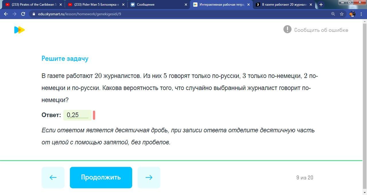 В газете работают 20 журналистов. Из них 5 говорят только по-русски, 3 только по-немецки, 2 по-немецки и по-русски. Какова вероятность того, что случайно выбранный журналист говорит только по-немецки?
