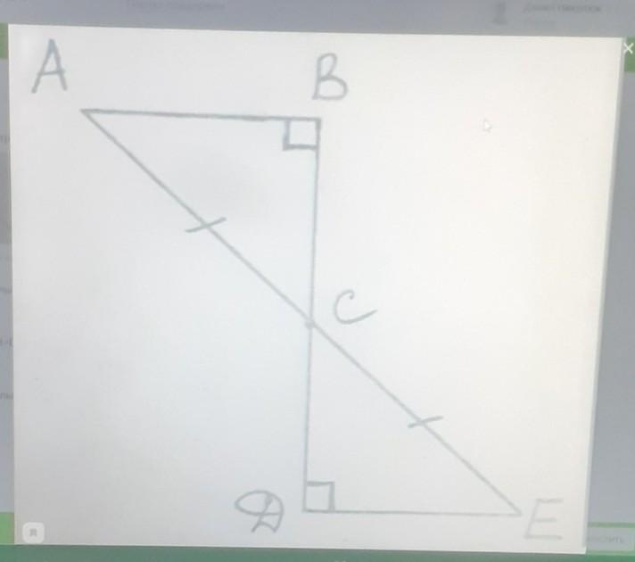 прямоугольные треуголники АВС и СDЕ равны т.к. 1)АС=СЕ,углы ВСА и СDЕ равны 2)АС=СЕ,АВ=DЕ 3)АС=СЕ,углы А и Е равны (((стопудовчики не решите)))