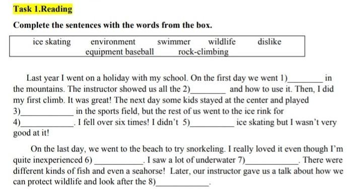 1) rock climbing equipment baseball 3.rock climbing 4.ice skating 5.dislike 6.swimmer 7.wildlife 8.enviroment