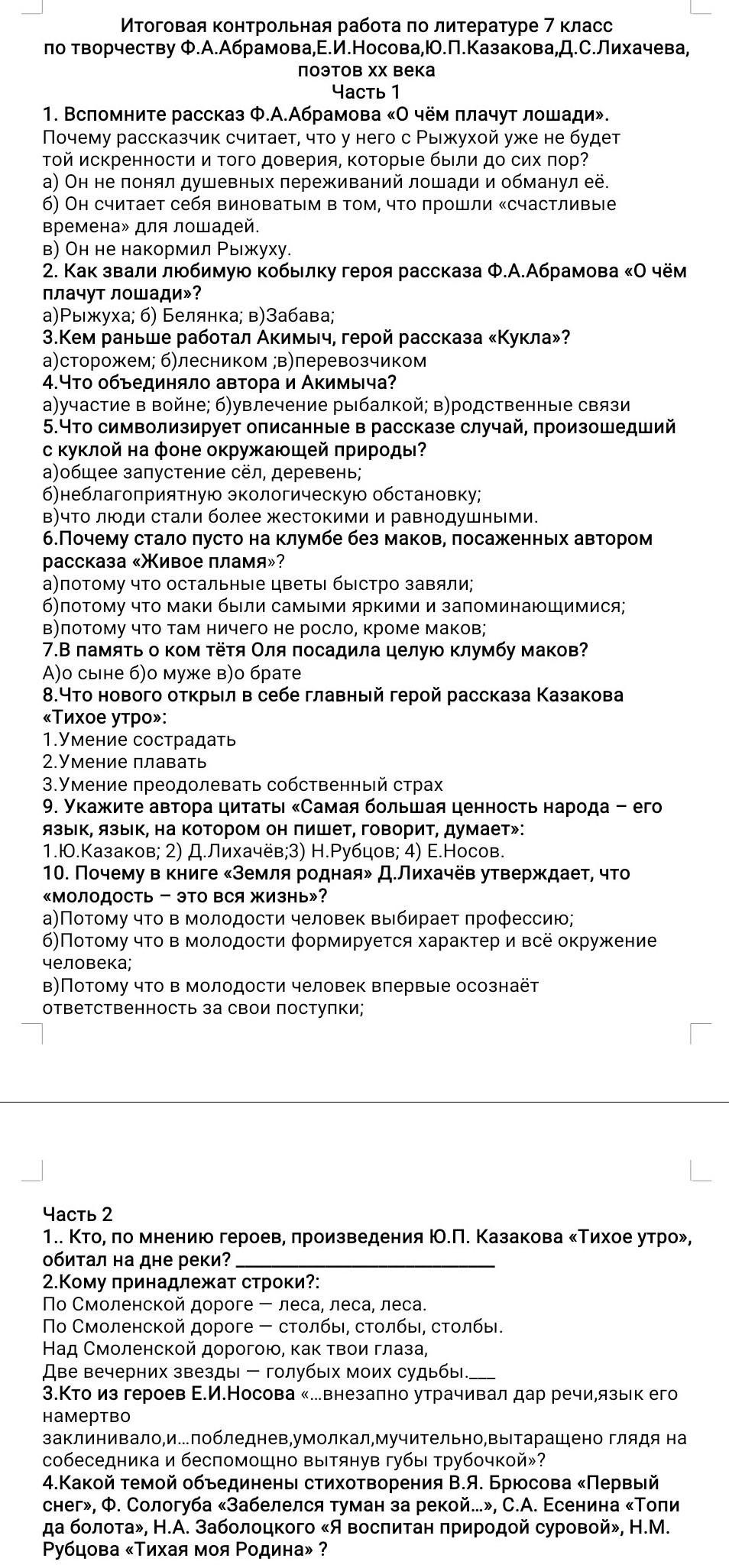 по творчеству Ф.А.Абрамова,Е.И.Носова,Ю.П. Казакова,Д.С.Лихачева,
