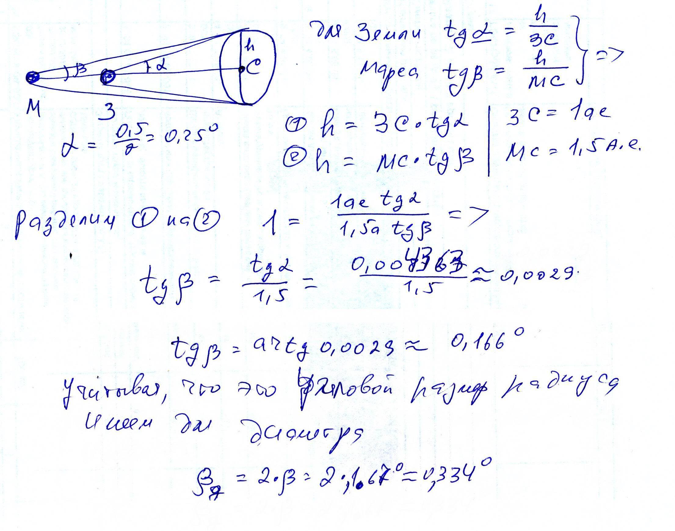 Чему равен угловой диаметр Солнца, наблюдаемого с Марса? Расстояние от Марса до Солнца 1.5 а.е.., угловой диаметр Солнца, наблюдаемого с Земли, равен 30'.
